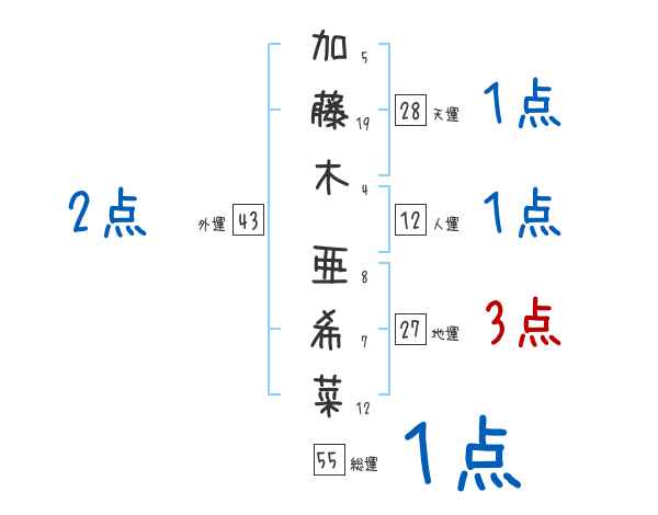 天運![]() | 加藤木亜希菜さんの天運は28画の1つ星!家庭環境に注意。スポーツで活躍できる能力があるかも。 家系が持つ宿命的な運勢を表します。祖先から受け継いだ苗字ですので自分の力が及びません。家柄を象徴します。 |