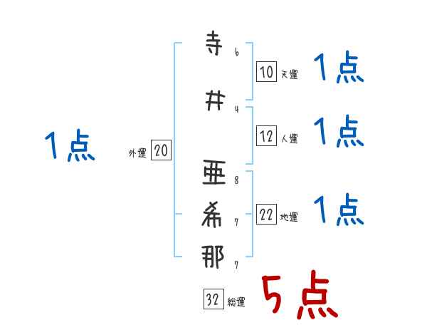 天運![]() | 寺井亜希那さんの天運は10画の1つ星!不安を感じやすい傾向。ストレスを抱えないように注意しましょう。 家系が持つ宿命的な運勢を表します。祖先から受け継いだ苗字ですので自分の力が及びません。家柄を象徴します。 |