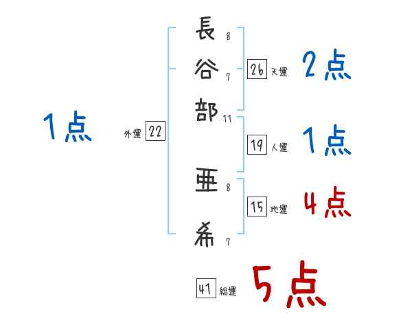 天運![]() | 長谷部亜希さんの天運は26画の2つ星!波瀾万丈かも。信頼できる人を大事にしましょう。 家系が持つ宿命的な運勢を表します。祖先から受け継いだ苗字ですので自分の力が及びません。家柄を象徴します。 |