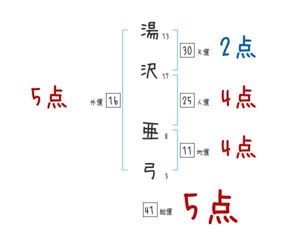 天運![]() | 湯沢亜弓さんの天運は30画の2つ星!浮き沈みの激しさに注意しましょう。 家系が持つ宿命的な運勢を表します。祖先から受け継いだ苗字ですので自分の力が及びません。家柄を象徴します。 |