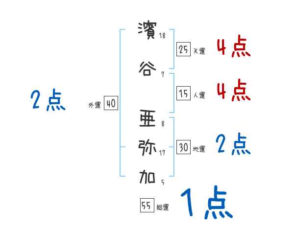 天運![]() | 濱谷亜弥加さんの天運は25画の4つ星!個性があり才能があふれる。強運の持ち主で発展する。 家系が持つ宿命的な運勢を表します。祖先から受け継いだ苗字ですので自分の力が及びません。家柄を象徴します。 |