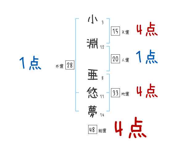 総運![]() | 小淵亜悠夢さんの総運は48画の4つ星!賢明な性格で人望が厚い。指導力があり多くの人に尊敬される。 あなたの人生を表す1番重要な運勢です。生涯を通じて影響する総合運となり、主に50歳以降の晩年期に影響を及ぼします。 |