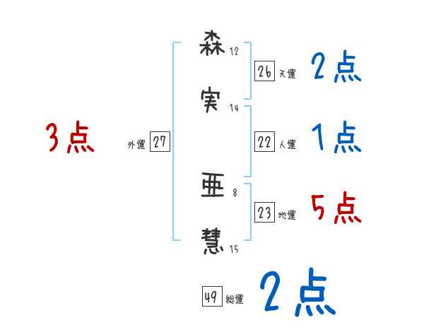 人運![]() | 森実亜慧さんの人運は22画の1つ星!努力することが苦手ないっぽう手先が器用。芸術性にも優れる。 性格や才能などを表す2番目に重要な運勢です。人間関係や協調性、社会的な成功に影響します。主に20歳から50歳ぐらいまでの中年期の運勢を表します。 |