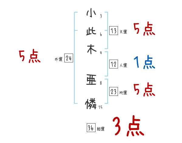 総運![]() | 小此木亜憐さんの総運は36画の3つ星!先見性が豊かです。多少神経質で苦労することも。 あなたの人生を表す1番重要な運勢です。生涯を通じて影響する総合運となり、主に50歳以降の晩年期に影響を及ぼします。 |