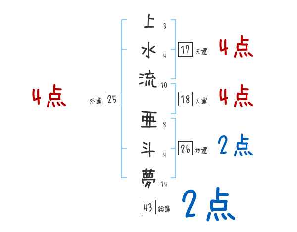 総運![]() | 上水流亜斗夢さんの総運は43画の2つ星!頑固な性格で独立心が強いかも。やや非現実的で浪費に注意しましょう。 あなたの人生を表す1番重要な運勢です。生涯を通じて影響する総合運となり、主に50歳以降の晩年期に影響を及ぼします。 |