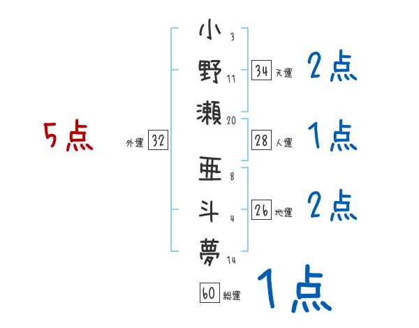 外運![]() | 小野瀬亜斗夢さんの外運は32画の5つ星!柔軟性があり成功する。チャンスが多く金運が良い。 生活面を象徴する運勢です。外部から受ける影響力を表し、結婚運、家庭運や職場、環境への順応性を表します。 |