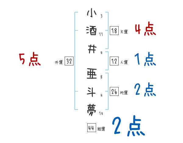 外運![]() | 小酒井亜斗夢さんの外運は32画の5つ星!柔軟性があり成功する。チャンスが多く金運が良い。 生活面を象徴する運勢です。外部から受ける影響力を表し、結婚運、家庭運や職場、環境への順応性を表します。 |