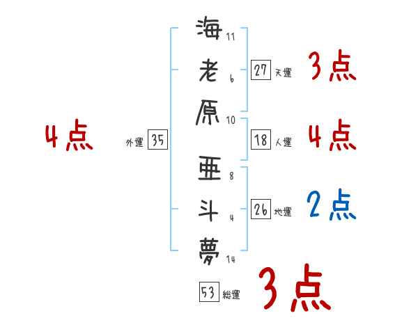 外運![]() | 海老原亜斗夢さんの外運は35画の4つ星!温厚な性格で感受性が高い。穏和な性格で人望が厚い。 生活面を象徴する運勢です。外部から受ける影響力を表し、結婚運、家庭運や職場、環境への順応性を表します。 |