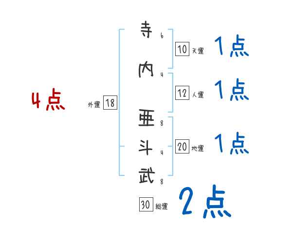 外運![]() | 寺内亜斗武さんの外運は18画の4つ星!情熱的で剛気。忍耐力があり信頼される。 生活面を象徴する運勢です。外部から受ける影響力を表し、結婚運、家庭運や職場、環境への順応性を表します。 |