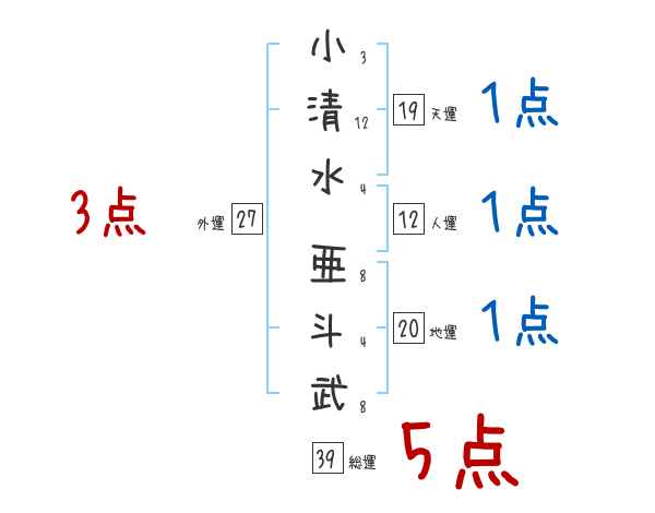 総運![]() | 小清水亜斗武さんの総運は39画の5つ星!社交性に優れ人望が厚い。人の上に立ち成功する。 あなたの人生を表す1番重要な運勢です。生涯を通じて影響する総合運となり、主に50歳以降の晩年期に影響を及ぼします。 |