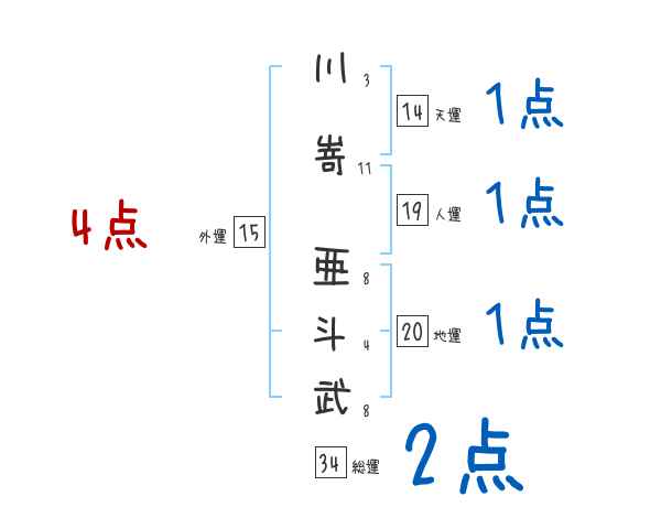 総運![]() | 川嵜亜斗武さんの総運は34画の2つ星!独創性に優れるが、自尊心が強く災難に注意しましょう。 あなたの人生を表す1番重要な運勢です。生涯を通じて影響する総合運となり、主に50歳以降の晩年期に影響を及ぼします。 |