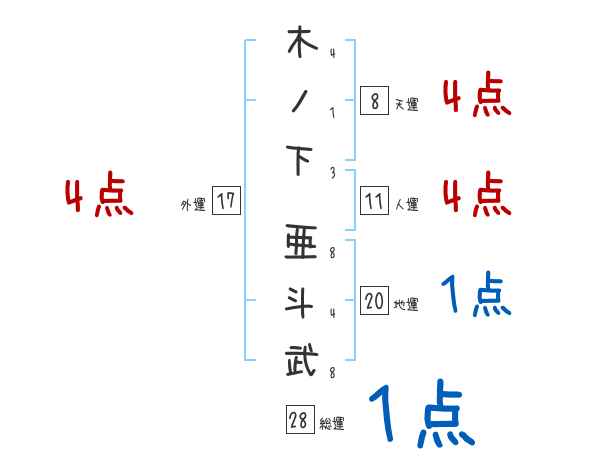 外運![]() | 木ノ下亜斗武さんの外運は17画の4つ星!積極的な行動力。地位を気づき財産を手に入れる。純粋な心と直感力。 生活面を象徴する運勢です。外部から受ける影響力を表し、結婚運、家庭運や職場、環境への順応性を表します。 |