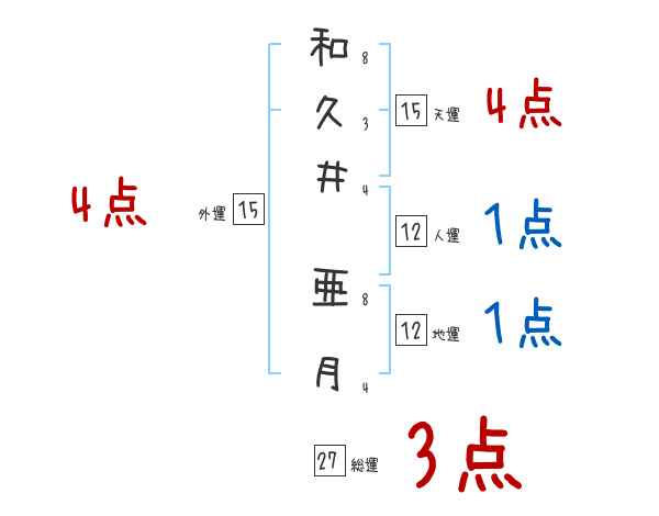 総運![]() | 和久井亜月さんの総運は27画の3つ星!頭脳明晰だが強情で摩擦が多い傾向。孤立に注意。 あなたの人生を表す1番重要な運勢です。生涯を通じて影響する総合運となり、主に50歳以降の晩年期に影響を及ぼします。 |