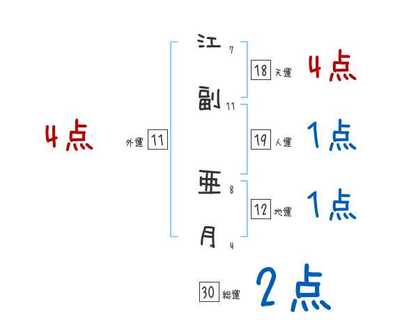 天運![]() | 江副亜月さんの天運は18画の4つ星!情熱的で剛気。忍耐力があり信頼される。 家系が持つ宿命的な運勢を表します。祖先から受け継いだ苗字ですので自分の力が及びません。家柄を象徴します。 |