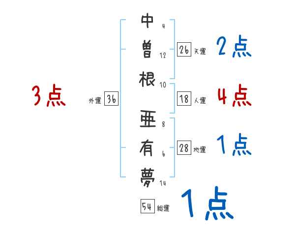 外運![]() | 中曽根亜有夢さんの外運は36画の3つ星!先見性が豊かです。多少神経質で苦労することも。 生活面を象徴する運勢です。外部から受ける影響力を表し、結婚運、家庭運や職場、環境への順応性を表します。 |