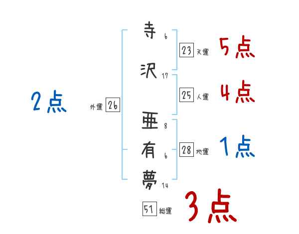 外運![]() | 寺沢亜有夢さんの外運は26画の2つ星!波瀾万丈かも。信頼できる人を大事にしましょう。 生活面を象徴する運勢です。外部から受ける影響力を表し、結婚運、家庭運や職場、環境への順応性を表します。 |