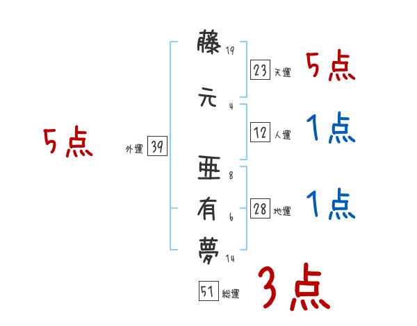 外運![]() | 藤元亜有夢さんの外運は39画の5つ星!社交性に優れ人望が厚い。人の上に立ち成功する。 生活面を象徴する運勢です。外部から受ける影響力を表し、結婚運、家庭運や職場、環境への順応性を表します。 |