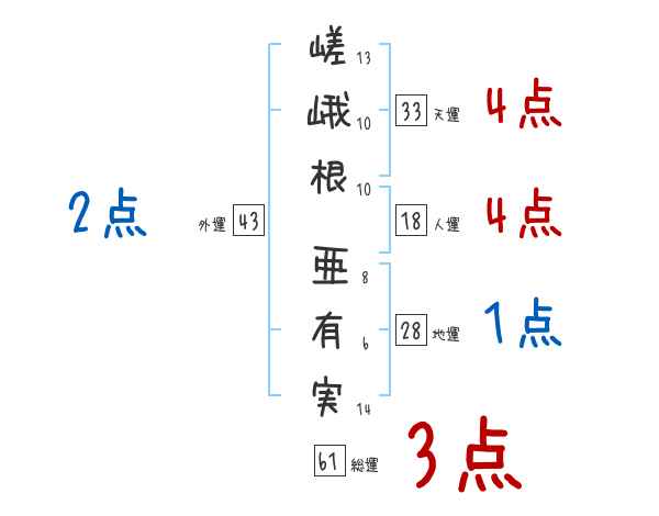 天運![]() | 嵯峨根亜有実さんの天運は33画の4つ星!権力志向でプライドが高い。勇気があり運を切り開き成功する。 家系が持つ宿命的な運勢を表します。祖先から受け継いだ苗字ですので自分の力が及びません。家柄を象徴します。 |