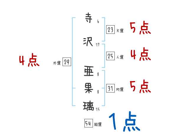 外運![]() | 寺沢亜果璃さんの外運は29画の4つ星!完全主義で才能がある。厳格な心の持ち主。 生活面を象徴する運勢です。外部から受ける影響力を表し、結婚運、家庭運や職場、環境への順応性を表します。 |