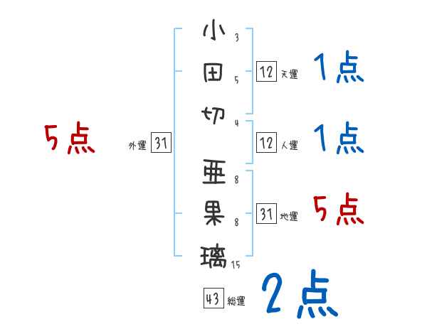 外運![]() | 小田切亜果璃さんの外運は31画の5つ星!社交性があり判断力に優れる。順風満帆な人生で円満な生活。 生活面を象徴する運勢です。外部から受ける影響力を表し、結婚運、家庭運や職場、環境への順応性を表します。 |