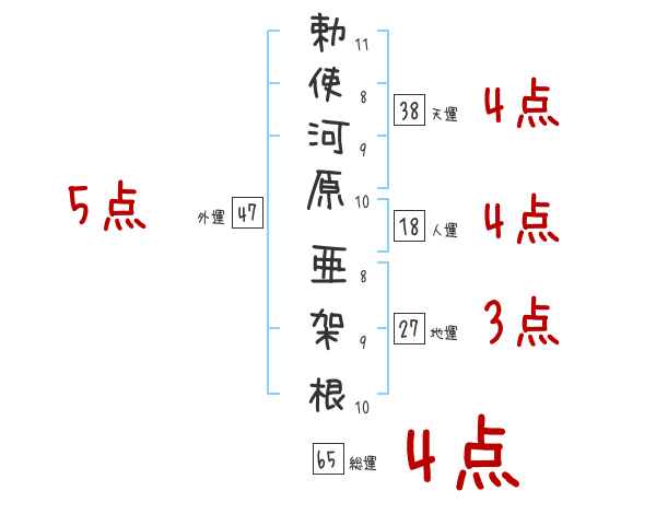 外運![]() | 勅使河原亜架根さんの外運は47画の5つ星!実力が開花し発展する円満な人生。財に恵まれる。 生活面を象徴する運勢です。外部から受ける影響力を表し、結婚運、家庭運や職場、環境への順応性を表します。 |