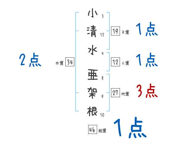 天運![]() | 小清水亜架根さんの天運は19画の1つ星!優れた才能を持ちますが、協調性が足りないことも。周りの人と協力する事を意識しましょう。 家系が持つ宿命的な運勢を表します。祖先から受け継いだ苗字ですので自分の力が及びません。家柄を象徴します。 |