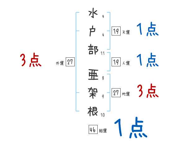 外運![]() | 水戸部亜架根さんの外運は27画の3つ星!頭脳明晰だが強情で摩擦が多い傾向。孤立に注意。 生活面を象徴する運勢です。外部から受ける影響力を表し、結婚運、家庭運や職場、環境への順応性を表します。 |