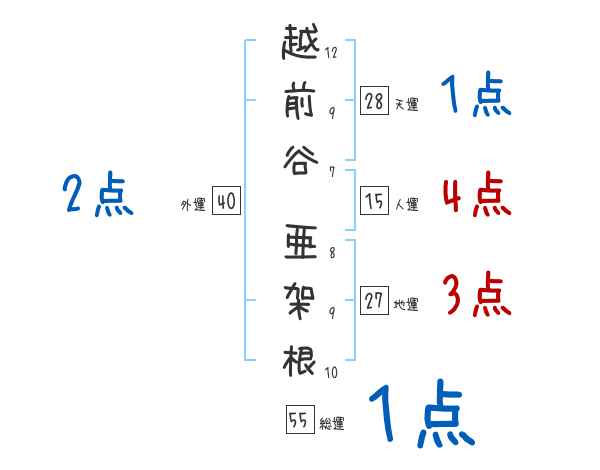 天運![]() | 越前谷亜架根さんの天運は28画の1つ星!家庭環境に注意。スポーツで活躍できる能力があるかも。 家系が持つ宿命的な運勢を表します。祖先から受け継いだ苗字ですので自分の力が及びません。家柄を象徴します。 |