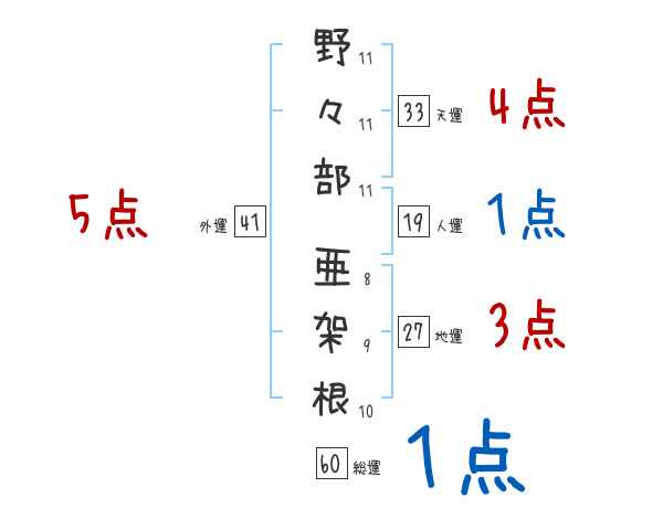 天運![]() | 野々部亜架根さんの天運は33画の4つ星!権力志向でプライドが高い。勇気があり運を切り開き成功する。 家系が持つ宿命的な運勢を表します。祖先から受け継いだ苗字ですので自分の力が及びません。家柄を象徴します。 |