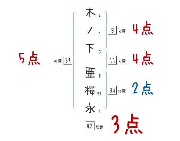 天運![]()  | 木ノ下亜桜永さんの天運は8画の4つ星!勤勉家。根気強く努力し成功する。忍耐力がある。 家系が持つ宿命的な運勢を表します。祖先から受け継いだ苗字ですので自分の力が及びません。家柄を象徴します。 |