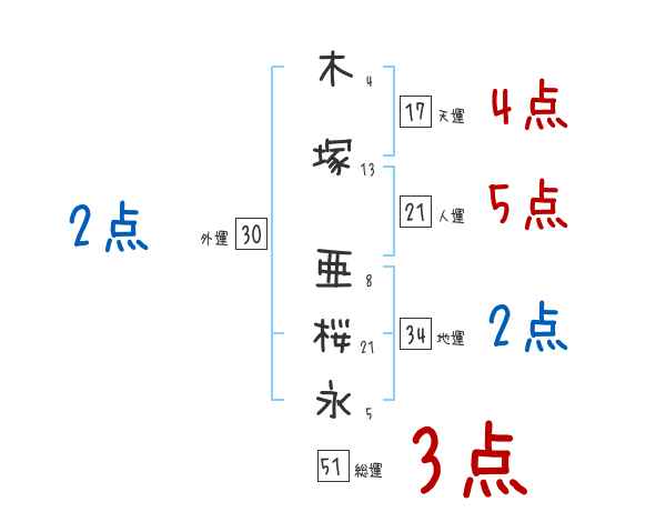 外運![]() | 木塚亜桜永さんの外運は30画の2つ星!浮き沈みの激しさに注意しましょう。 生活面を象徴する運勢です。外部から受ける影響力を表し、結婚運、家庭運や職場、環境への順応性を表します。 |