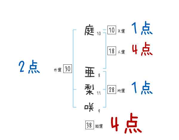 外運![]() | 庭亜梨咲さんの外運は30画の2つ星!浮き沈みの激しさに注意しましょう。 生活面を象徴する運勢です。外部から受ける影響力を表し、結婚運、家庭運や職場、環境への順応性を表します。 |