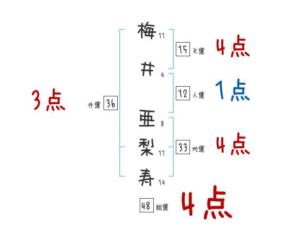 外運![]() | 梅井亜梨寿さんの外運は36画の3つ星!先見性が豊かです。多少神経質で苦労することも。 生活面を象徴する運勢です。外部から受ける影響力を表し、結婚運、家庭運や職場、環境への順応性を表します。 |