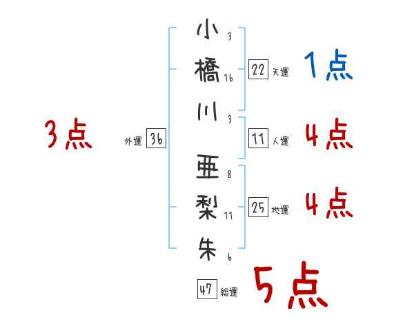 外運![]() | 小橋川亜梨朱さんの外運は36画の3つ星!先見性が豊かです。多少神経質で苦労することも。 生活面を象徴する運勢です。外部から受ける影響力を表し、結婚運、家庭運や職場、環境への順応性を表します。 |