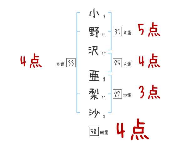 外運![]() | 小野沢亜梨沙さんの外運は33画の4つ星!権力志向でプライドが高い。勇気があり運を切り開き成功する。 生活面を象徴する運勢です。外部から受ける影響力を表し、結婚運、家庭運や職場、環境への順応性を表します。 |