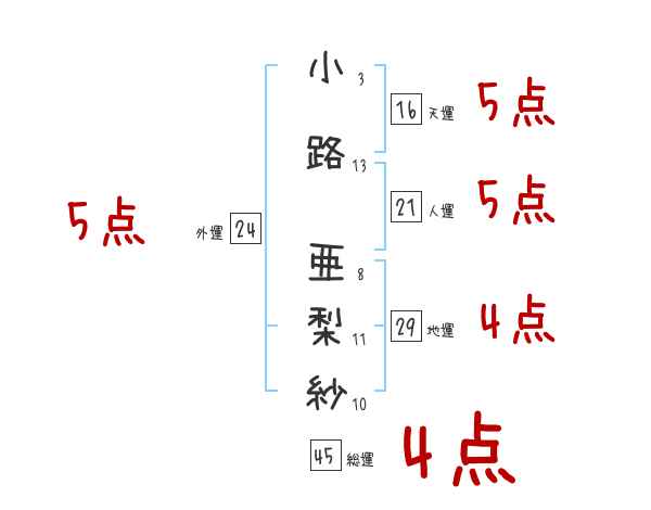 総運![]() | 小路亜梨紗さんの総運は45画の4つ星!もくもくと物事を進め達成する。地味な努力家。 あなたの人生を表す1番重要な運勢です。生涯を通じて影響する総合運となり、主に50歳以降の晩年期に影響を及ぼします。 |