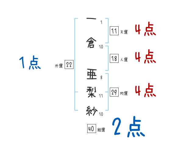 外運![]() | 一倉亜梨紗さんの外運は22画の1つ星!努力することが苦手ないっぽう手先が器用。芸術性にも優れる。 生活面を象徴する運勢です。外部から受ける影響力を表し、結婚運、家庭運や職場、環境への順応性を表します。 |