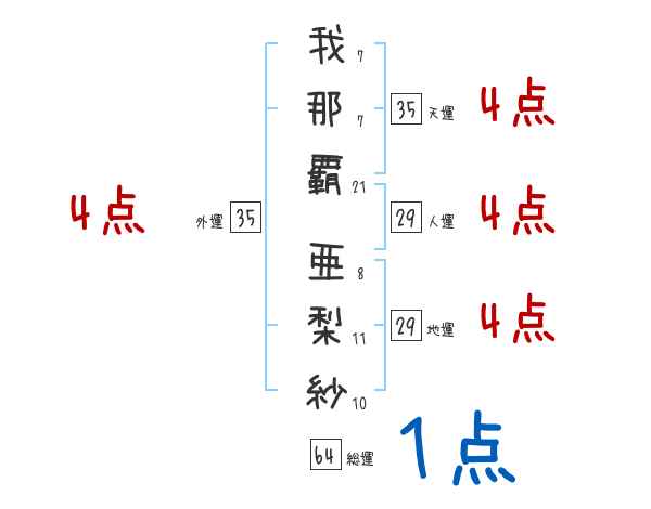 天運![]() | 我那覇亜梨紗さんの天運は35画の4つ星!温厚な性格で感受性が高い。穏和な性格で人望が厚い。 家系が持つ宿命的な運勢を表します。祖先から受け継いだ苗字ですので自分の力が及びません。家柄を象徴します。 |