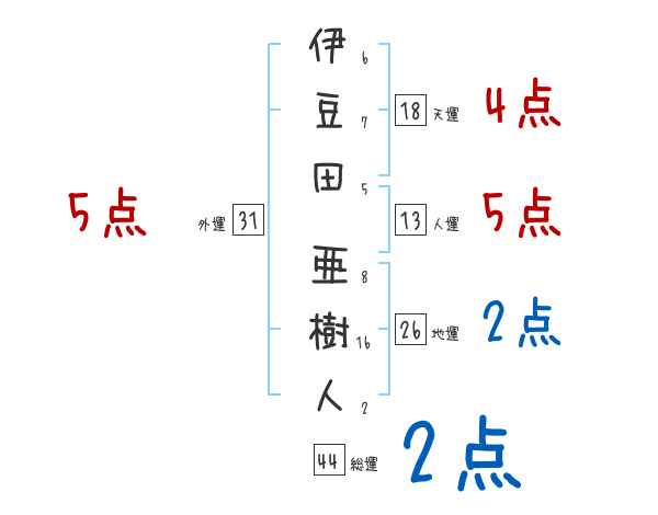 外運![]() | 伊豆田亜樹人さんの外運は31画の5つ星!社交性があり判断力に優れる。順風満帆な人生で円満な生活。 生活面を象徴する運勢です。外部から受ける影響力を表し、結婚運、家庭運や職場、環境への順応性を表します。 |
