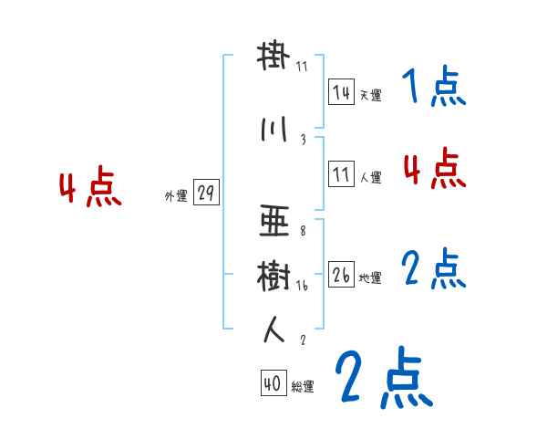 地運![]() | 掛川亜樹人さんの地運は26画の2つ星!波瀾万丈かも。信頼できる人を大事にしましょう。 個性を表す基礎的な運勢です。性格形成や対人関係、行動力など家庭環境に影響されます。主に誕生してから20歳くらいまでの若年期の運勢を表します。 |