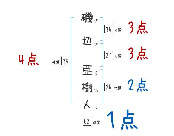 天運![]() | 磯辺亜樹人さんの天運は36画の3つ星!先見性が豊かです。多少神経質で苦労することも。 家系が持つ宿命的な運勢を表します。祖先から受け継いだ苗字ですので自分の力が及びません。家柄を象徴します。 |