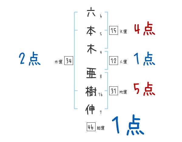 総運![]() | 六本木亜樹伸さんの総運は46画の1つ星!迷走することが多く苦労するかも。目先のことにとらわれないように。 あなたの人生を表す1番重要な運勢です。生涯を通じて影響する総合運となり、主に50歳以降の晩年期に影響を及ぼします。 |