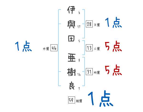 天運![]() | 伊與田亜樹良さんの天運は28画の1つ星!家庭環境に注意。スポーツで活躍できる能力があるかも。 家系が持つ宿命的な運勢を表します。祖先から受け継いだ苗字ですので自分の力が及びません。家柄を象徴します。 |