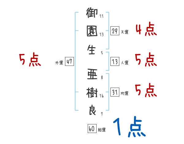 外運![]() | 御園生亜樹良さんの外運は47画の5つ星!実力が開花し発展する円満な人生。財に恵まれる。 生活面を象徴する運勢です。外部から受ける影響力を表し、結婚運、家庭運や職場、環境への順応性を表します。 |