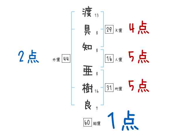 天運![]() | 渡具知亜樹良さんの天運は29画の4つ星!完全主義で才能がある。厳格な心の持ち主。 家系が持つ宿命的な運勢を表します。祖先から受け継いだ苗字ですので自分の力が及びません。家柄を象徴します。 |