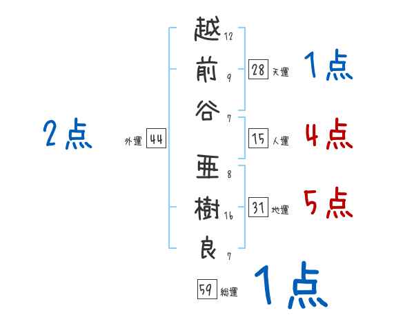 総運![]() | 越前谷亜樹良さんの総運は59画の1つ星!意志の弱さであきらめることが多いかも。粘り強さが必要。 あなたの人生を表す1番重要な運勢です。生涯を通じて影響する総合運となり、主に50歳以降の晩年期に影響を及ぼします。 |