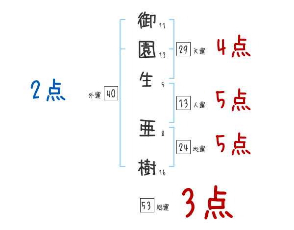 総運![]() | 御園生亜樹さんの総運は53画の3つ星!やや見栄っ張りで虚栄心がある。散財に注意。 あなたの人生を表す1番重要な運勢です。生涯を通じて影響する総合運となり、主に50歳以降の晩年期に影響を及ぼします。 |