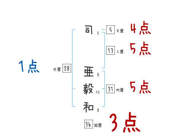 天運![]() | 司亜毅和さんの天運は5画の4つ星!健康で安泰。協調性に優れ、財産に恵まれる。 家系が持つ宿命的な運勢を表します。祖先から受け継いだ苗字ですので自分の力が及びません。家柄を象徴します。 |