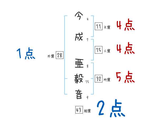 外運![]() | 今成亜毅音さんの外運は28画の1つ星!家庭環境に注意。スポーツで活躍できる能力があるかも。 生活面を象徴する運勢です。外部から受ける影響力を表し、結婚運、家庭運や職場、環境への順応性を表します。 |