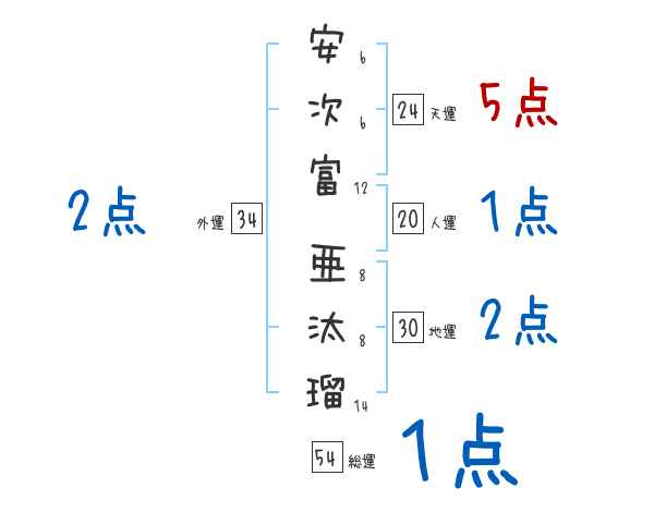 天運![]() | 安次富亜汰瑠さんの天運は24画の5つ星!家庭運が良く順調な人生。金運にも恵まれる。 家系が持つ宿命的な運勢を表します。祖先から受け継いだ苗字ですので自分の力が及びません。家柄を象徴します。 |